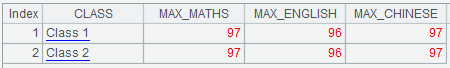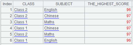 | 2 | =A1.query("select CLASS, SUBJECT,max( SCORE) THE_HIGHEST_SCORE from STUDENTSCORE group by CLASS, SUBJECT") |