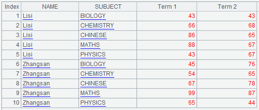 Here, first of all, we need to merge mathematics, Chinese and other columns into subject column, which need column-to-row operation; and to split term column into term one and term two columns, we need row-to-column operation.
