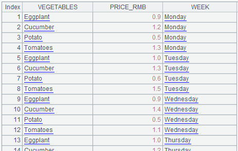 | 2 | =A1.query("select * from VEGETABLEPRICES") | |