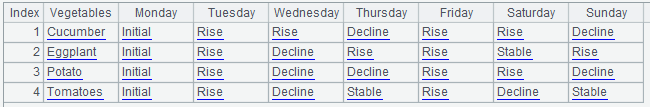 And I want to calculate the price trend of all kinds of vegetables in a week, which includes four states: rise, decline, stable and initial (Monday value).