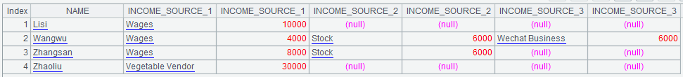 MANE INCOME_SOURCE_1 INCOMR_AMOUNT_1 INCOME_SOURCE_2 INCOMR_AMOUNT_2 ……