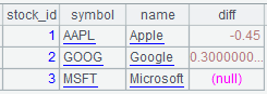 diff is the result of subtracting from the newest price of a stock the previous price. If one or less prices are present for a particular stock I should get NULL.