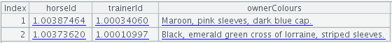 | 3 | =A2.new(horseId,trainer.trainerId:trainerId,ownerColours) |