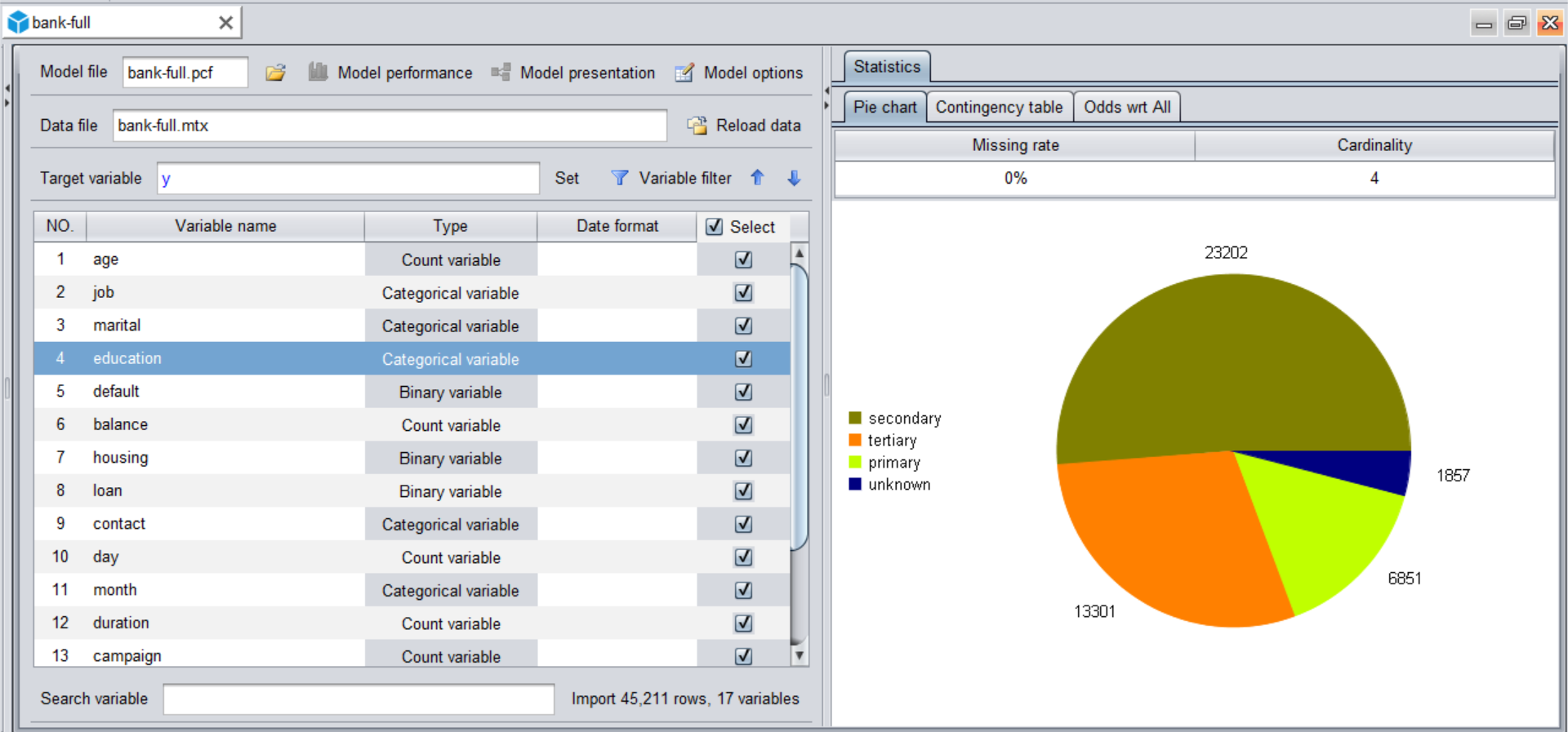The model will be ready after several or dozens of minutes, or even shorter, according to the data size. The importance degrees of all variable will be automatically shown. Variables listed in the top positions have greater impact on the result. The feature can help do some business analyses. When the target variable is the sales, for instance, we can identify the important factors that have more impact on it.