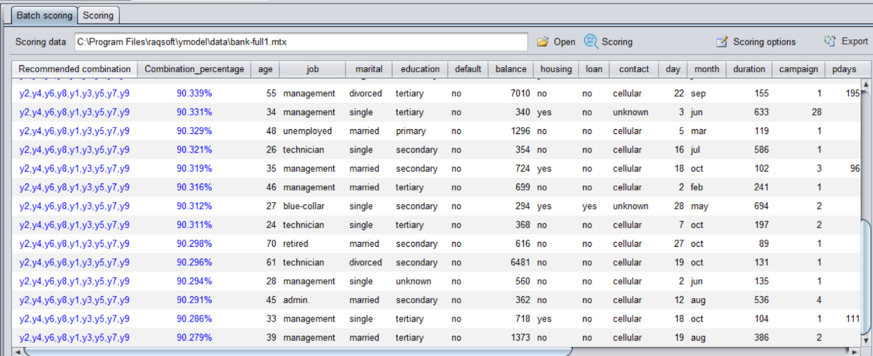 The first column on the left is the content of the product portfolio, and the second column is the probability that the user will buy the portfolio. Once the results are exported, the product portfolio purchase list is generated, and the top customers with higher probability can be marketed. It should be noted that there is no lift curve for the combination probability. The number of top customers will depend on the situation (usually this number will be more than the number of customers for a single product).