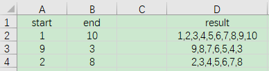 A2 Loop through each row of A1, create a new sequence of numbers from start and end, and then use commas to concatenate the sequence into the text.