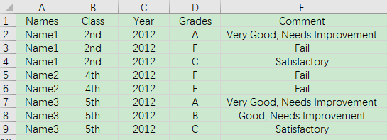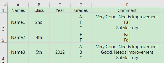 A3 Loop each row of A2 and convert this row into multiple rows. The number of rows is the number of members in the Grades sequence. In each row, take the original Names, Class, and Year columns, the #th member of the Grades sequence is the new column Grades, and the #th member of the Comment sequence is the new column Comment, where # represents the row number converted from this row.