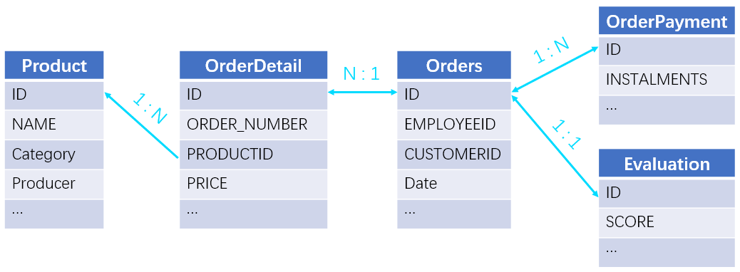 【Example 7】Get order information of the year 2014 (order IDs, product names and total amounts) where the product name contains “water” and order amount is greater than 200, and that do not pay in installment and get 5-star evaluation. Below is part of the source data and the relationships between tables: