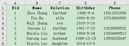 Associative query on the main table and detailed table data, Example: Some data in the employee information table employee.xlsx and employee family member table family.xlsx are as follows. Please query the information of employees who have an elderly person over 70 years old at home.