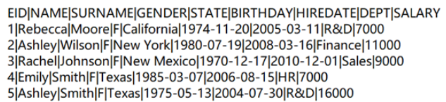 =file("d:/txt/employee.txt":"utf-8").import@t(EID,NAME,GENDER,DEPT;,"|")