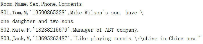 Phone values are single quoted to be converted into strings. The slash \ at the end of the second row enables line continuation, and the escape character \r\n in the last row means that the current Comments value covers two rows.