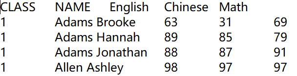Example: Get scores of students in class 10 from the following student scores table Students_scores.txt. The first row of the file contains column names, and detailed data begins from the second row, as shown below: