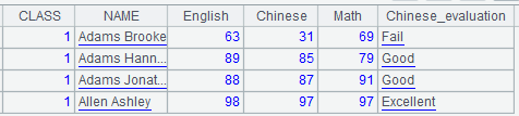 Example 2: Get the evaluation result for each student’s Chinese score based on the student scores table.