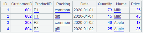 The switch function cannot be used for multi-foreign-key association. Instead, the join function should be used to do that. Suppose the Prices are different for different types of packaging, and we add a Packing field to both the product information table and the orders information table. Now the product information table has a composite primary key of ID field and Packing field. Below are parts of the two tables: