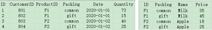 Example: The order information and the product information are stored in two Excel files respectively. We are trying to calculate the sales amount in each order. Data structures of the two files are as follows: