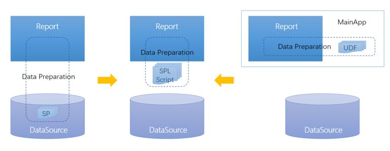 SP has its disadvantages. The practice of storing SP within the database causes tight coupling between report and database, as well as maintenance difficulty. Any change of the report needs the corresponding modification of SP through the database operation, which poses potential security problems. SP is unmigratable and narrowly applicable, and becomes invalid once the database is split, extended, or replaced by another type of database.