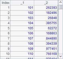 A1 returns the user-defined cursor RandDataCursor. A2 invokes UserUtils’s newCursor method to pass take A1’s result as a parameter to pass in. Here A2’s data is the cursor data in SPL. The third parameter in A2 is the cursor’s option, such as "t", which means the first row in the cursor is the header row. A3 skips the first 100 records. A4 fetches 100 records from A2’s cursor and closes the cursor. Below is A4’s result: