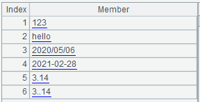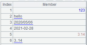 In the numeric value viewing panel, the strings are underlined to distinguish types. Note, however, that the date format needs to be set in the application environment, and only date written in the same format of the environment settings can be parsed correctly. For example, 2020/05/06 in the image above can not be parsed to a date type because it is not in the same format as the environment.