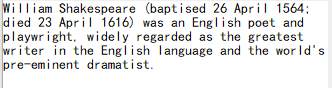 | 1 | William Shakespeare (baptised 26 April 1564; died 23 April 1616) was an English poet and playwright, widely regarded as the greatest writer in the English language and the world's pre-eminent dramatist. | A paragraph of text |