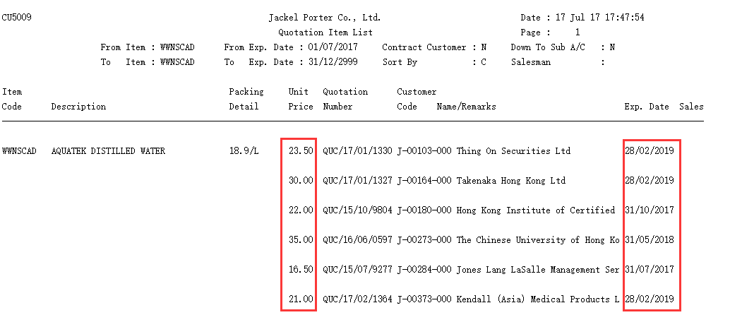 The lines before the horizontal line are complex table headers, and each line after that is a quote record with blank lines between them. What the picture shows are just a table header and quotation record area, which is repeated over and over again in a text file. The red boxes are field column Unit Price and Exp. Date respectively, with the Quotation Number, Customer Code, Customer Name field columns in the middle, all separated by spaces.