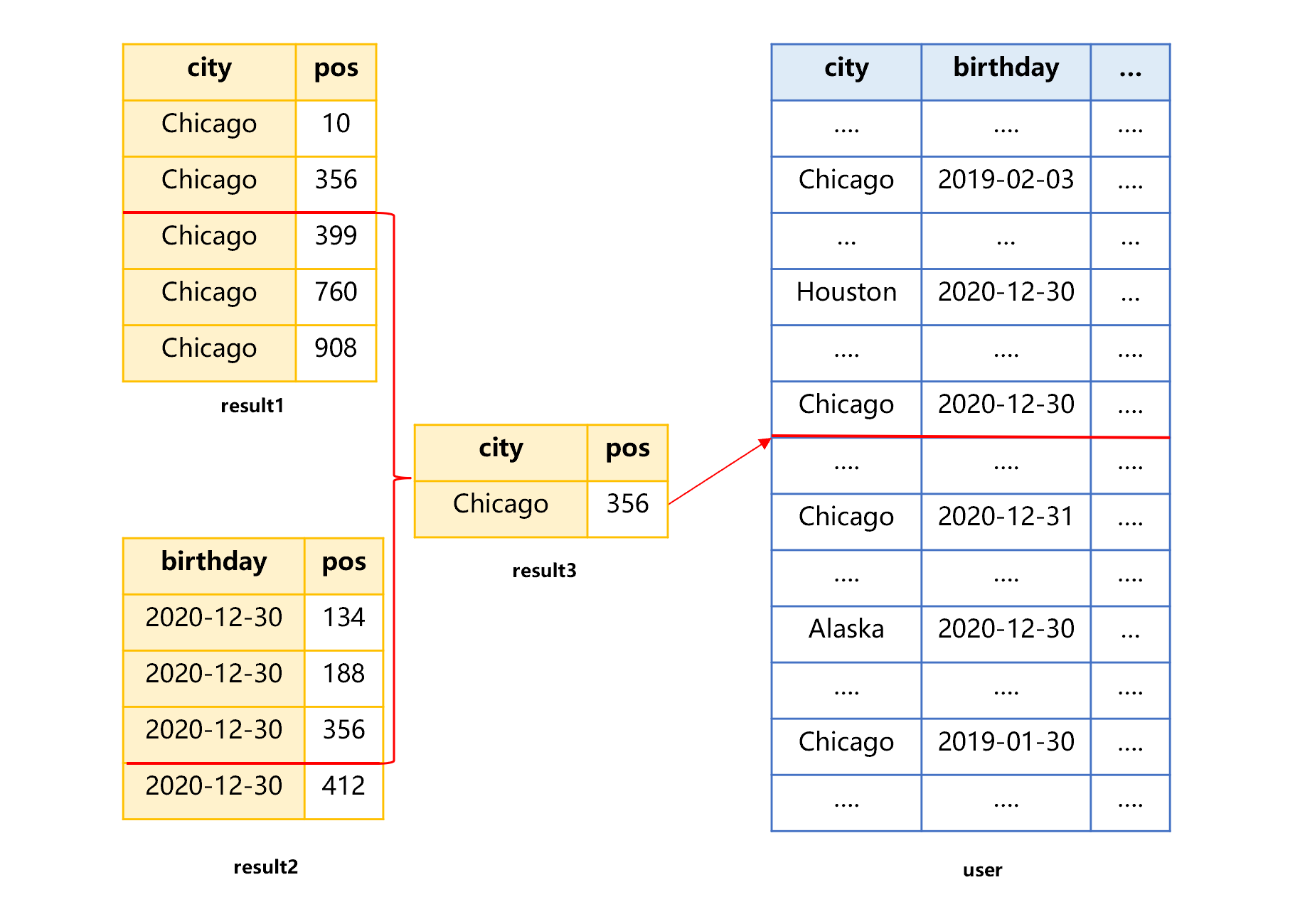 In this figure, both result 1 and 2 are ordered by the physical position (pos) of record. In this case, as long as using the merge algorithm to get the intersection (result 3) of the two results, we can get an index that satisfies two conditions of city and birthday, and then, using the position of record in result 3, the record that meets the conditions can be taken out from the user table.