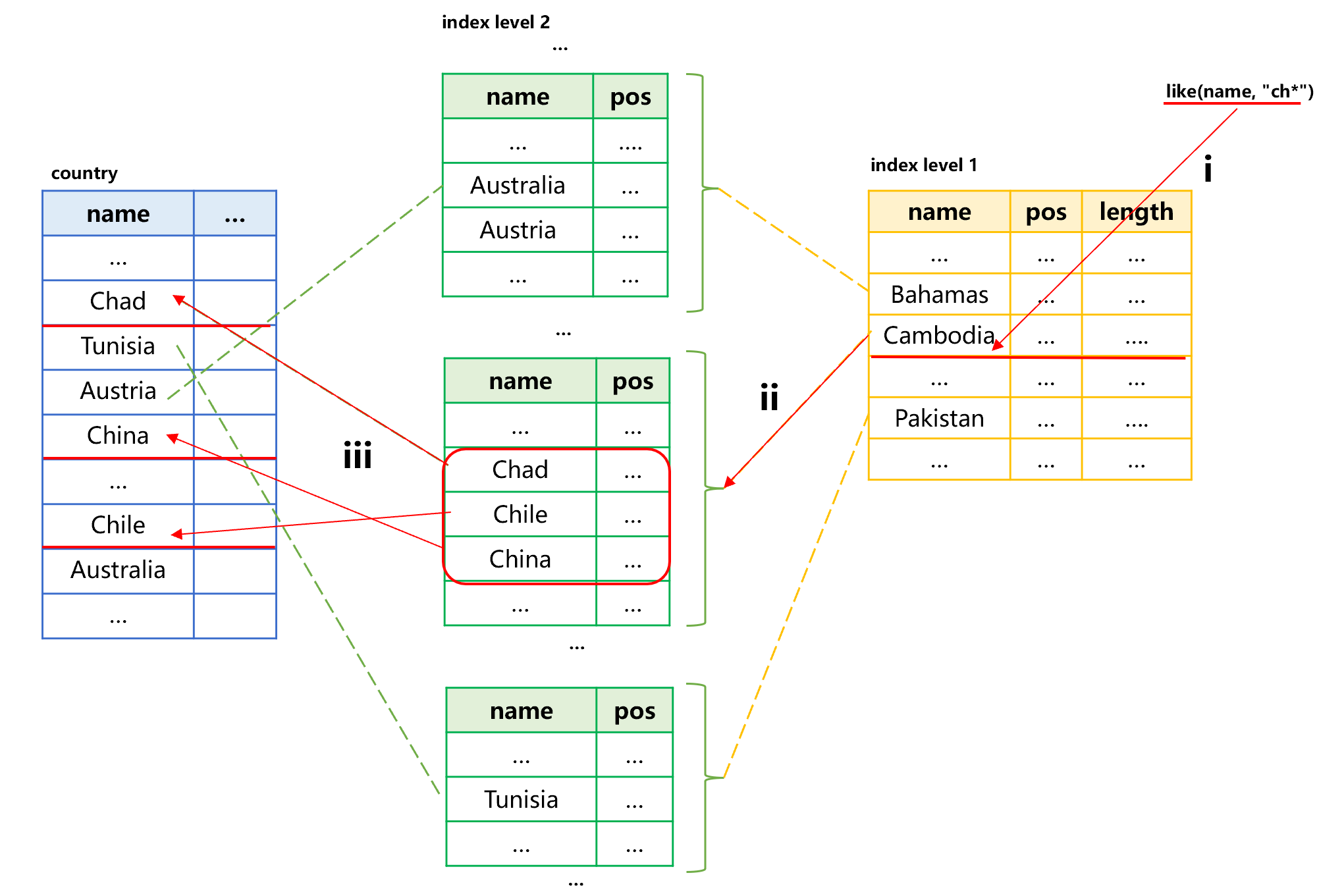 In this figure, assume the index of country names has two levels. Since the index is ordered by name, the records that meet the condition like(name, “Ch*”) are definitely stored continuously in the sorting index level 1 and 2. The search is divided into three steps, i), find the names starting with Ch from the index level 1, which are all in the Cambodia segment, and obtain their position and length in index level 2 segment; ii), read the index level 2 segment into the memory according to their position and length to find the first country Chad starting with Ch, and continue traversing until there is a country that does not start with Ch, at this time, we can get the position of all records starting with Ch in the original table; iii), sort these positions, and go to the original table to obtain target record.