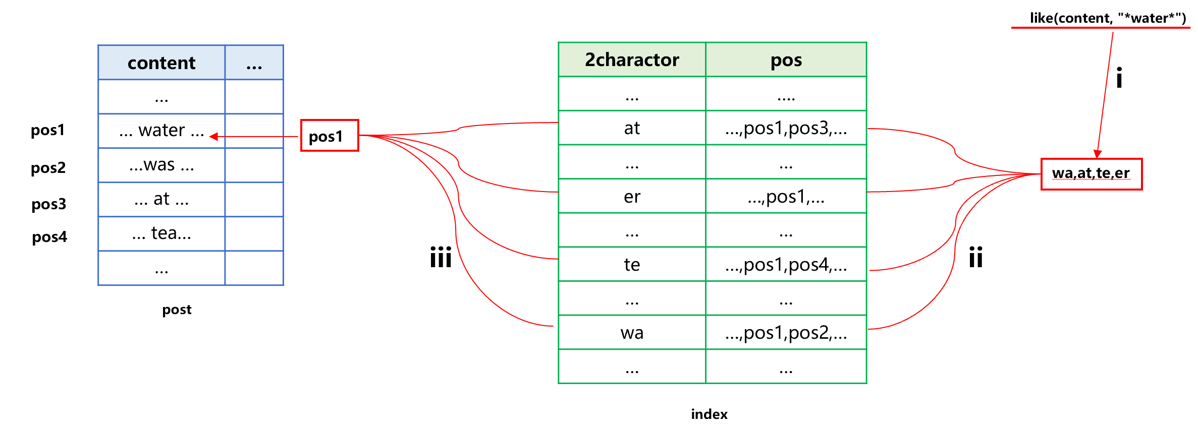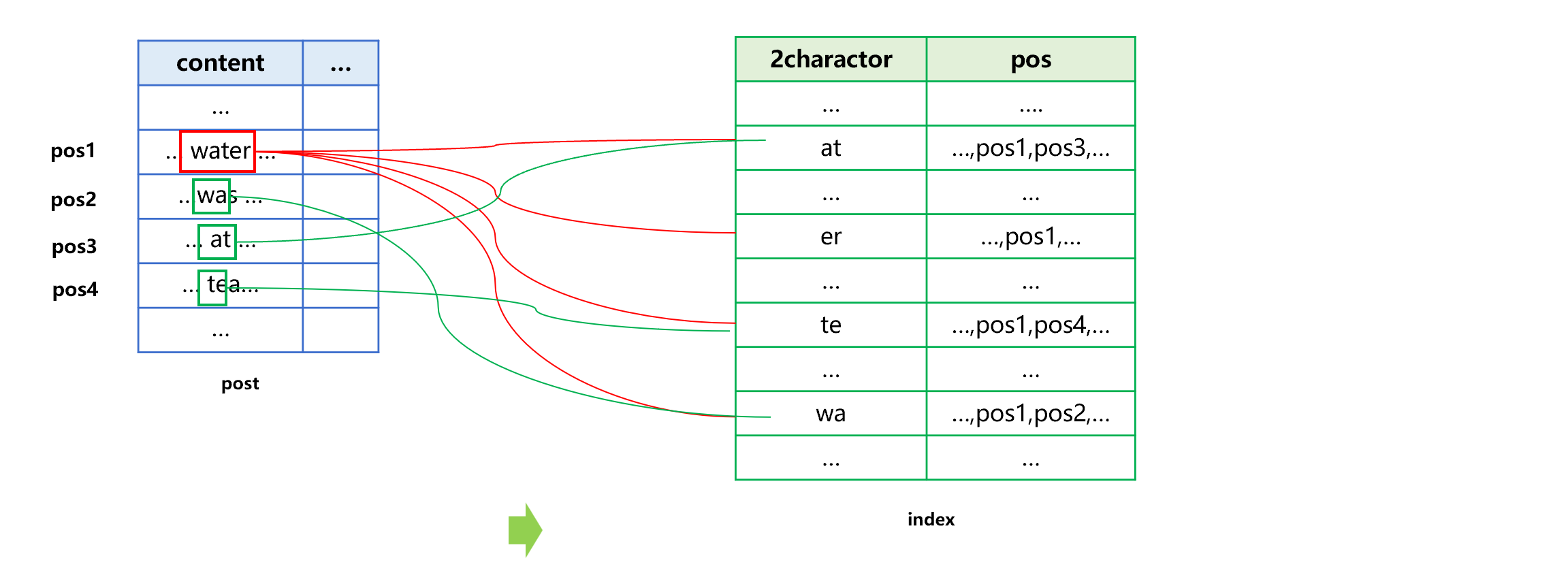 First, take apart the string in the content field, and take out all combinations of two (or three) characters that have appeared. For example, from the ‘water’ in the content field of record at pos1, we can get four combinations, wa, at, te, and er, and save them together with pos1, where the record containing “water’ is located.