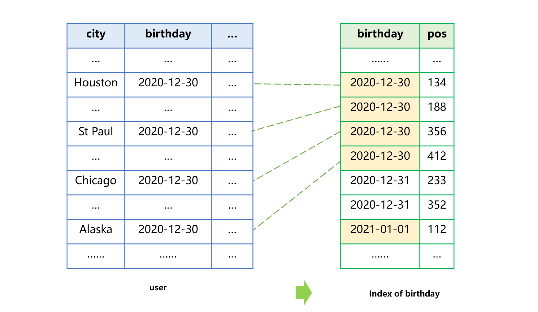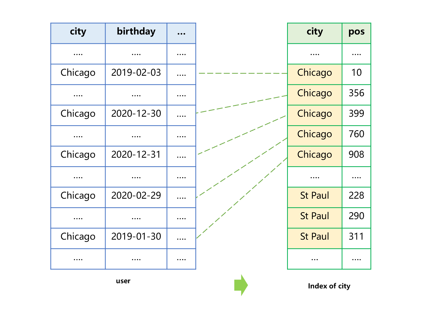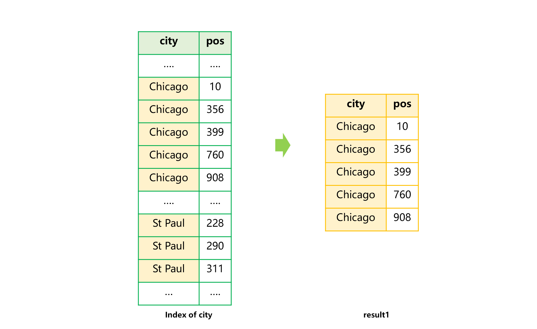 We can see from figure 1 that the sorting process for generating index will not change the order of multiple Chicago records in the original table. Therefore, in the index, not only will the same city (e.g., Chicago) be stored together, but the pos of multiple records of same city in original table are also sorted from small to large.