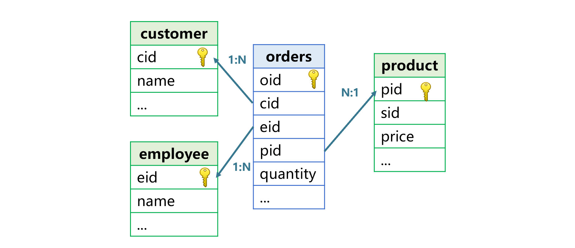 First, let’s see the foreign key association, it refers to using the non-primary key fields of one table to associate the primary key of the other. In this context, we call the former table the fact table, and the latter table the dimension table. For example, in the figure below, the orders table is a fact table, and the customer table, product table and employee table are the dimension table.