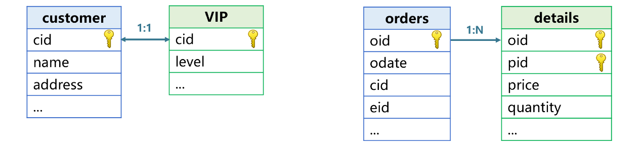 Let’s now move on to the primary key association. This association refers to using the primary key of one table to associate the primary key or part of primary keys of the other, such as the association between customer table and VIP customer table, and between orders table and details table in the figure below.