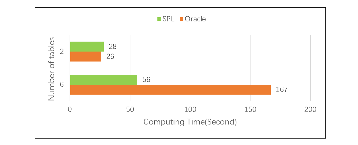 The following test shows the performance difference between SPL and Oracle when the number of association tables is different, from which we can see that the advantage of foreign key addressization is quite obvious in the case of more tables.