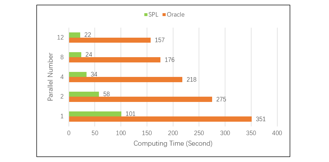 The following test compares the speed of SPL and Oracle in performing the association calculation between large fact table and small dimension table under different number of parallel calculations. The result shows that SPL runs 3 to 8 times faster than Oracle. See the figure for test results:
