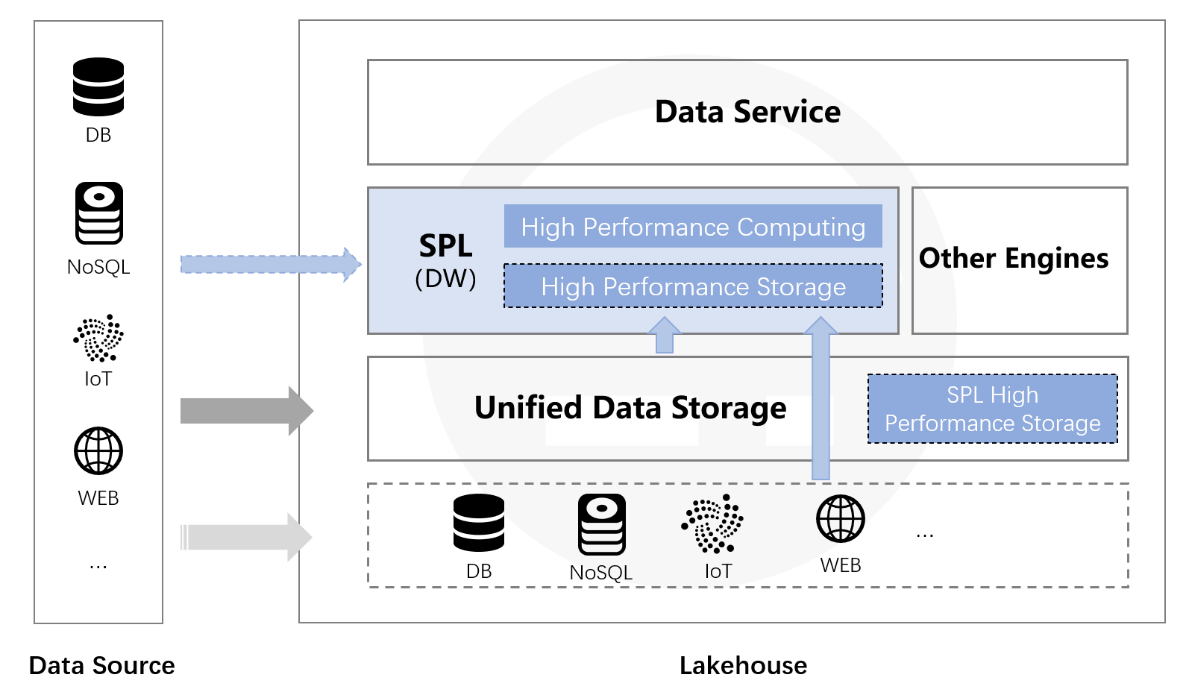 SPL has the ability to directly calculate the raw data of data lake without constraints, and there is no need to load data into database. Moreover, SPL has the mixed computing ability for diverse data sources. Whether the data lake is built based on a unified file system or diverse data sources (RDB, NoSQL, LocalFile, Webservice), a direct mixed computing can be done in SPL to quickly output the value of data lake. Furthermore, the high-performance file storage (the storage function of data warehouse) that SPL provides can be utilized to allow data to be organized unhurriedly when calculations are going on in SPL, while loading the raw data into SPL’s storage can obtain higher performance. The data are still stored in file system after they are organized in SPL storage, and theoretically, they can be stored in the same place with data lake. In this way, a real Lakehouse is implemented.