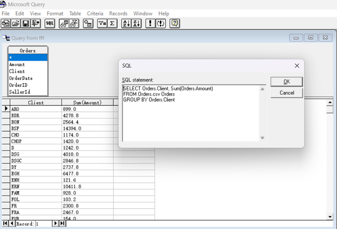 SQL syntaxes that Microsoft Query supports include the from clause, fuzzy query, part of string and date functions, but it doesn’t support with clause. Although it supports association query, it is limited to query between files of the same type; it doesn’t support association query between csv and xls files because Microsoft Query provides separate driver for each of the two types of files and the two cannot be used simultaneously. In addition, it has strict requirements on the form of file and cannot process files with irregular form.