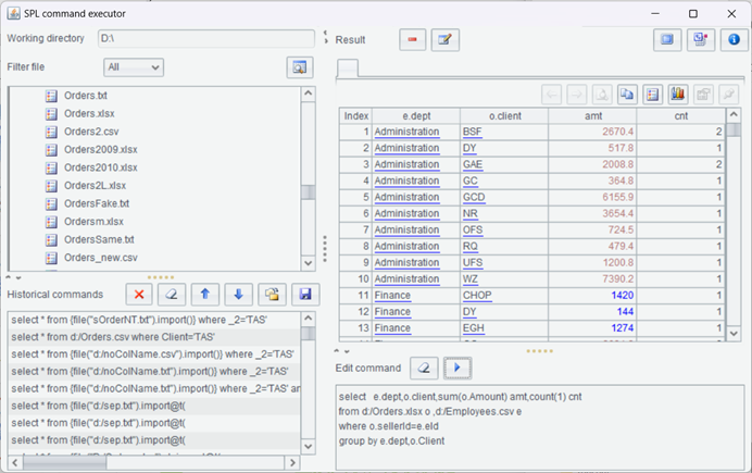 esProc Desktop is small in size, supports one-click installation, provides a relatively friendly graphical interface, and does not need to configure the file before executing SQL. esProc Desktop has a self-developed computing engine, allowing us to execute SQL without resorting to database, and achieve better performance even for large files. In terms of SQL syntax, esProc Desktop supports with and from subqueries, fuzzy query, a lot of string and date functions, as well as the association calculation between csv and xls files. In addition to csv/xls file, it also supports json/xml/http and many other data sources. Moreover, with esProc's native syntax, the files with irregular form can be processed very well.