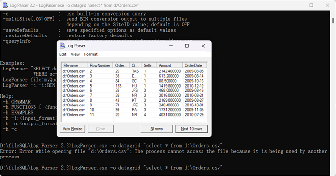 Log Parser is both a command line tool and a desktop tool, and supports csv file and multiple log forms, featuring low technical requirements and above-average user interface in operation difficulty, but it is weak in SQL syntax.