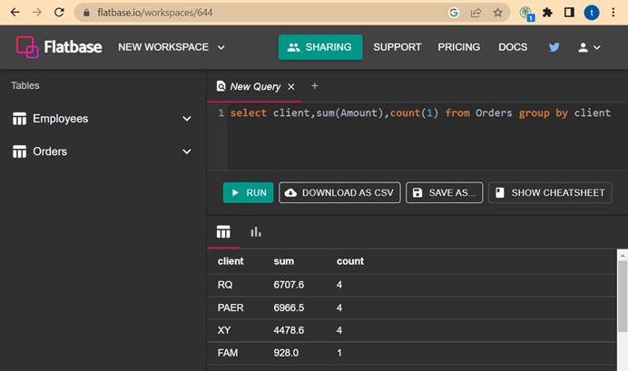 The advantage of Flatbase is that we don't need to download and install, just open the website and register an account. When it comes to SQL syntax ability, it supports fuzzy query, association, from clause, with clause, and a large number of string and date functions.