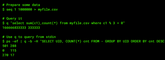 csvq provides only one binary executable file, no installation and configuration are required and we can execute SQL directly without any preparation. In terms of SQL syntax, csvq supports fuzzy query, association query, from clause, with clause, window function, and a lot of string and date functions. In addition to csv file, it also supports json file.