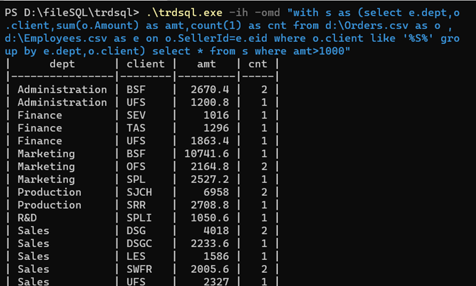 trdsql provides only one binary executable file, no installation and configuration are required and we can execute SQL directly without any preparation. In terms of SQL syntax, trdsql supports fuzzy query, association query, from clause, with clause, window function, and a lot of string and date functions. trdsql encapsulates multiple databases, which can be switched with option according to our habits.