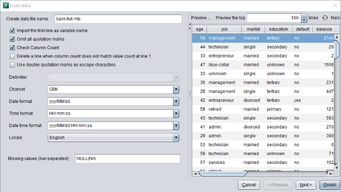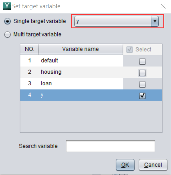 First, use YModel to import data, and then select ‘y’ as the target variable (prediction target) and save it as bank-full.mcf.