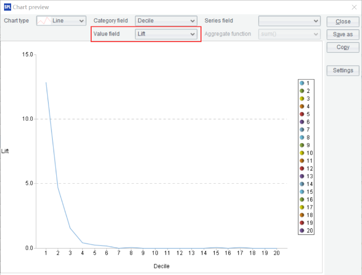 For example, click on the value of the 6th record of A6, then click on the “Chart preview” icon in the upper right corner and select “Lift” in the value field, you can view the Lift curve.