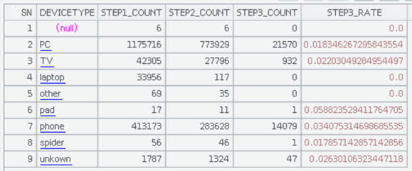 Then, based on the calculation results, group and aggregate the numbers of distinct users by the devicetype of sessions table to which these events correspond, and finally divide step3_count by step1_count to calculate the conversion rate of three-step funnel.