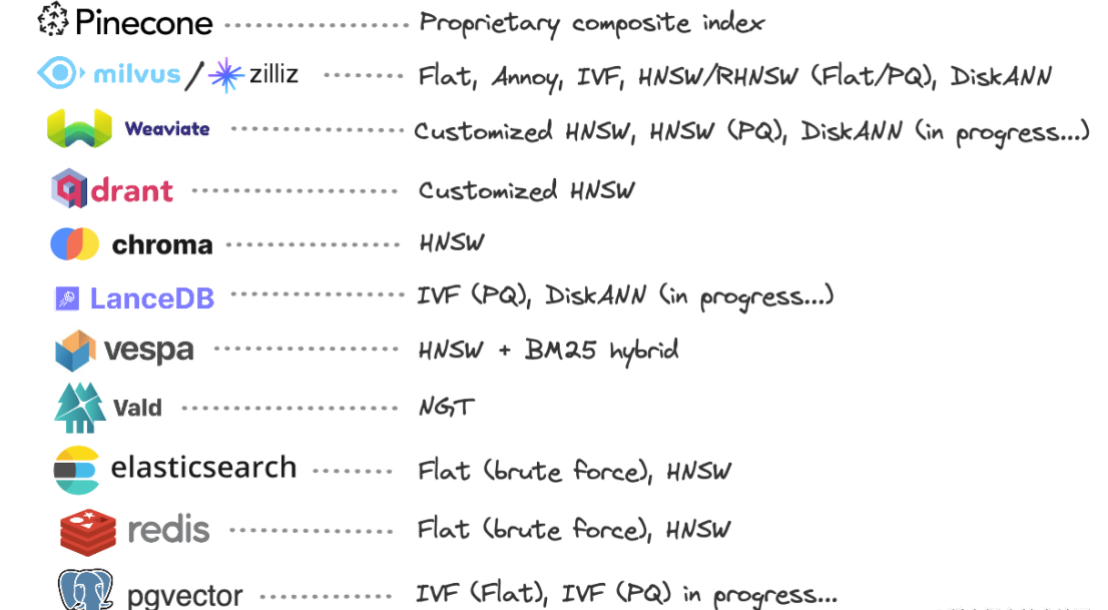 3. There is a need to choose an algorithm for creating index or even to choose a vector database. The key of efficient vector search is to have an index that adapts to the characteristics of data distribution. However, there are too many index creation algorithms, such as k-means clustering, IVF-PQ, Faiss, HNSW, LSH. Understanding these algorithms alone requires a lot of mathematical knowledge and, usually, only after repeatedly adjusting the parameters can a clustering algorithm with high search efficiency and high accuracy be obtained (take the parameter k of k-means as an example, it is almost impossible for developers who have little knowledge on data or lack experience to set a suitable k value). What’s worse, a vector database usually only provides a few index algorithms, yet such algorithms are not universally applicable, and need to be chosen based on the characteristics of data distribution. If a vector database is chosen arbitrarily, and the index is found unsuitable for the data of the database after a long time of algorithm parameter adjustment (the search efficiency or accuracy cannot meet requirements), then changing the database may be a disaster. The figure below shows the index creation methods of several top-ranked vector databases: