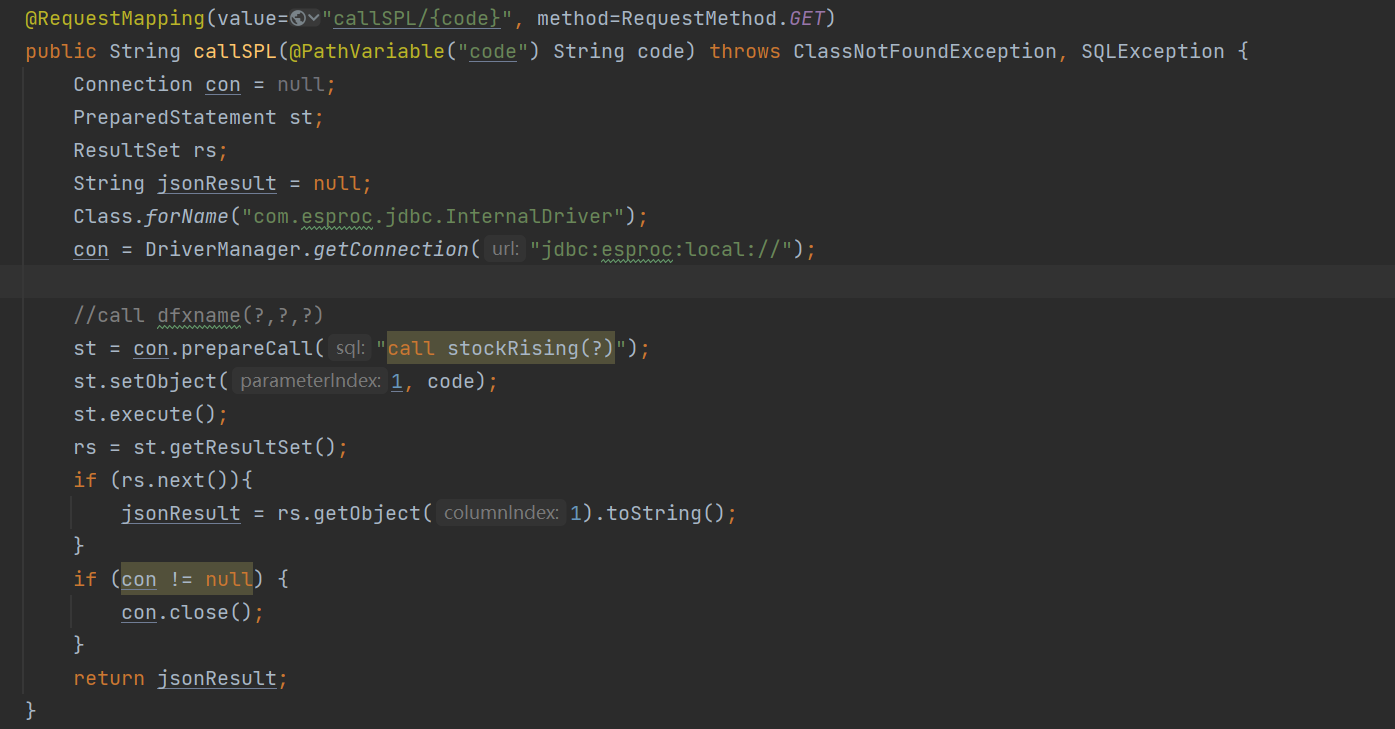 Let’s take another look at the framework aspect. esProc SPL is pure Java software that can be seamlessly embedded into any Java application in the form of jar packages, just like the code written by programmers themselves, enjoying the advantages of mature Java frameworks together. esProc SPL provides a standard JDBC driver, allowing Java programs to call SPL code like executing database SQL or stored procedures. This is equivalent to embedding a lightweight and powerful database engine into Java.