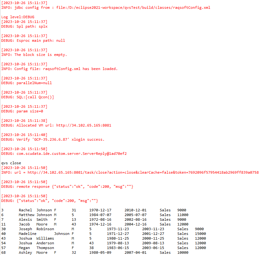Now we illustrate how to use the embedded QVS through an example – to connect to QVA on GCE via the embedded QVS and then request QVM to execute the script file employee-cursor.splx in bucket unbucket100 on the remote storage service GCS. By default, both QVA and QVM are in the startup state.