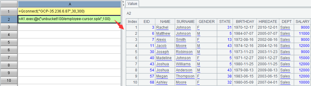 | 2 | =A1.exec@x("unbucket100/employee-cursor.splx";100) | Execute the script file on GCS via QVS; use @x option to close QVM automatically after the result is returned. |