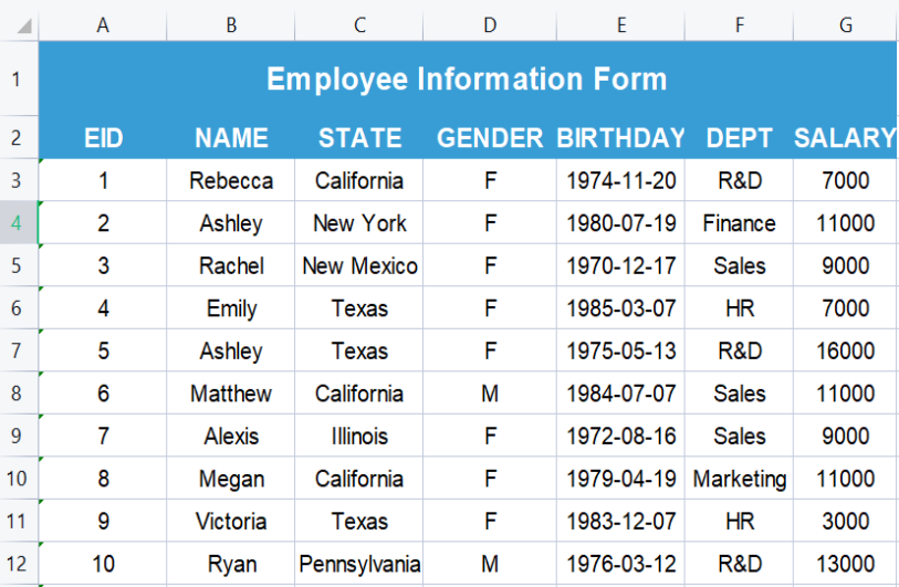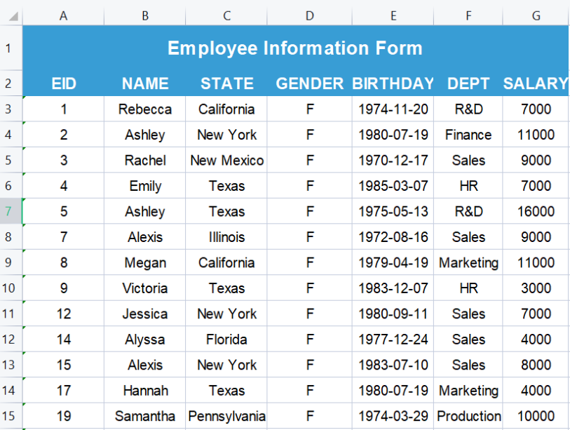 | 1 | =file("E:/employee.csv").import@t(;,",") |