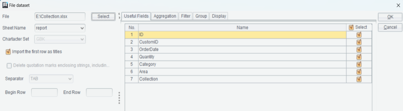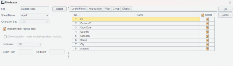 In the above example, the data read by SPL script and the data of report dataset come from the same xls file. In practice, different xls files or other types of data files can be used, as long as the data structure is consistent with that of report dataset.