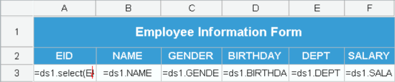 ReportLite adopts an Excel-like design; its cell naming and some common formulas are consistent with Excel. The formula ‘=ds1.select(EID)’ in cell A3 means to retrieve the data of EID column from ds1. When viewing the report results, the data in this cell will be automatically filled based on the data in data file. For other cells, writing ‘=ds1.column name’ can retrieve the data of the corresponding column directly.
