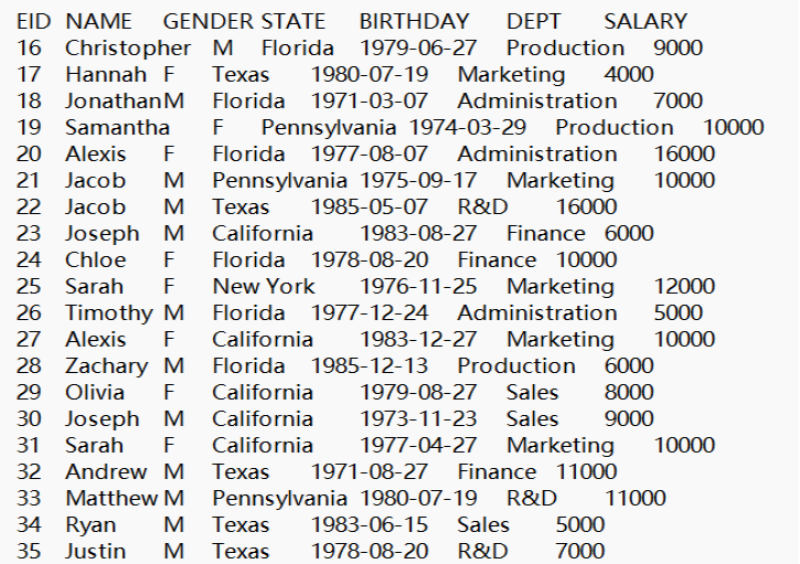 | 2 | =A1.query("select * from EMPLOYEE where gender='F'") |